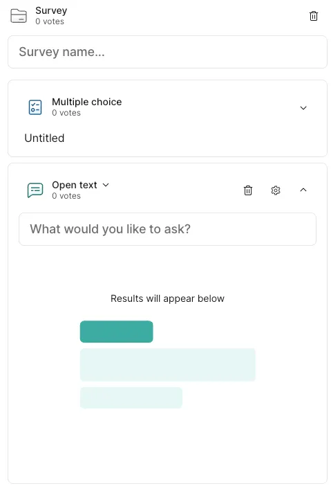 - Survey - Create a survey combining multiple questions (unlike the above 6 types, participants answer multiple questions collectively as one set).