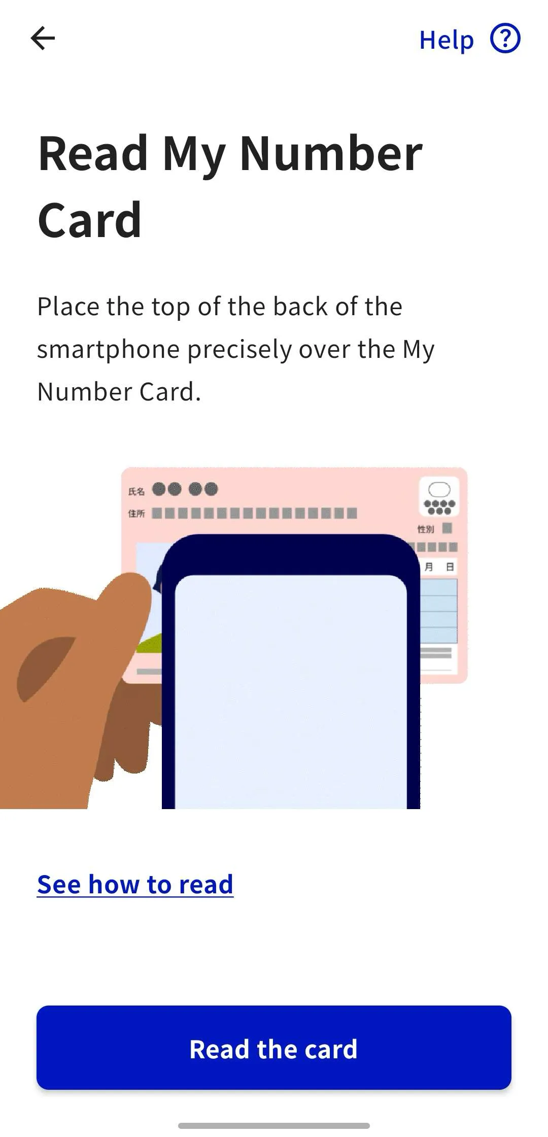Follow the instructions in the app, tap the “Read the card” button, and scan your My Number Card with your smartphone.
