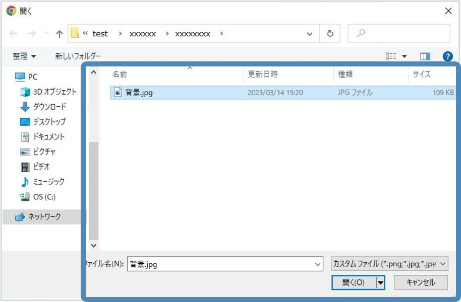 3. 利用したいファイルを選択します.「開く」を選択し,ファイルをアップロードします.