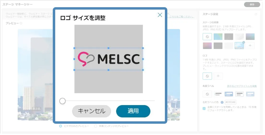6. ロゴのサイズをスライドバー()で調整し,「適用」を選択します.ロゴが設定されます.