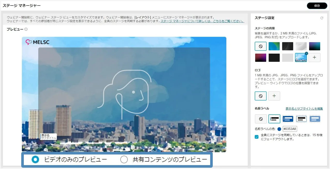• ステージマネージャー機能を使用すると,背景やロゴ・カスタマイズした名前ラベルをステージに設定でき,効果的なウェビナーの開催に貢献します.