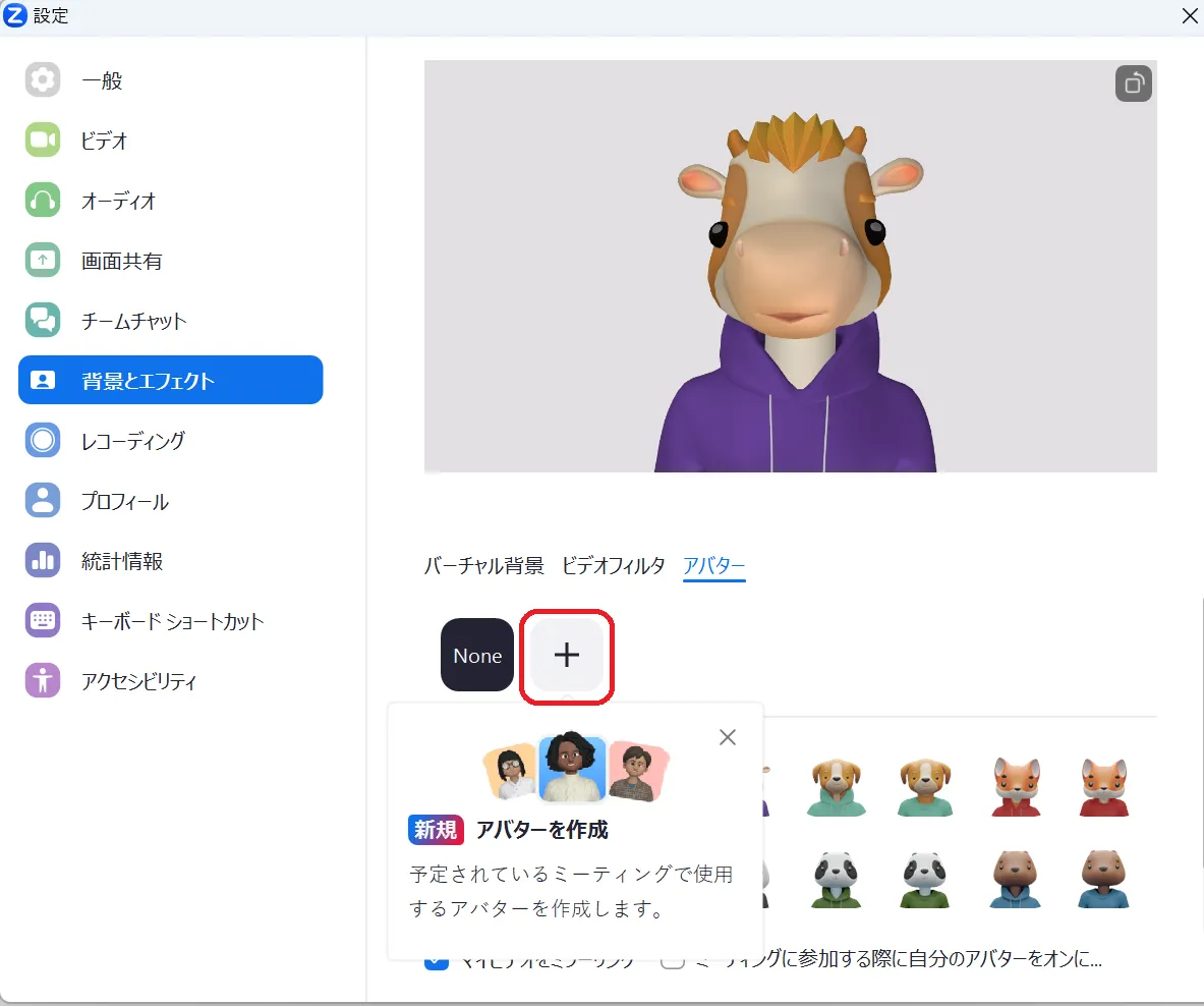 3. 好みのアバターを選んでください.(アバターを設定するとカメラに映る背景が表示されなくなり,アバターだけが表示されるようになります.バーチャル背景を設定している場合は設定している画像がアバターの背後に表示されます.) ※バーチャル背景設定時